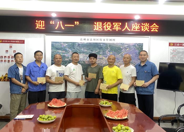 “八一”是彩色的,是軍旅迷彩,是愛(ài)國(guó)紅,是橄欖綠,當(dāng)然也可以是水務(wù)藍(lán)。為了學(xué)習(xí)和推崇退役軍人身上的寶貴品質(zhì),并將集團(tuán)黨委對(duì)退役軍人的關(guān)懷傳達(dá)到每一個(gè)退役老兵,7月31日上午,達(dá)川區(qū)分公司召開(kāi)了慶祝建軍97周年“八一”座談會(huì),支部書(shū)記卿仕明與支委班子一道同分公司的退伍軍人們共聚一堂,歡慶“八一建軍節(jié)”。