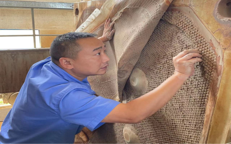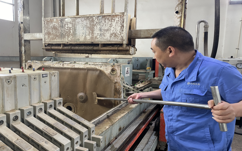 2018年1月,王穎被安排到新建成的周家壩污水廠工作,由于有污泥脫水的工作經(jīng)驗(yàn),帶頭學(xué)習(xí)新廠新設(shè)計(jì)的板框壓濾系統(tǒng)的重?fù)?dān)自然而然落在他肩上,他沒(méi)有抱怨新廠離家遠(yuǎn)、交通不便利、脫水車(chē)間環(huán)境差等客觀問(wèn)題,而是靜下心來(lái)一頭扎進(jìn)學(xué)習(xí)的熱潮中。板框脫水系統(tǒng)看似只有進(jìn)泥、調(diào)泥、壓泥、出泥幾道工序,但整套流程下來(lái)需要進(jìn)行數(shù)十次步驟,還要根據(jù)泥質(zhì)調(diào)整步驟中的參數(shù),不厭其煩地記錄下每一次的試驗(yàn)數(shù)據(jù),午餐時(shí)間他都毅然堅(jiān)守在現(xiàn)場(chǎng),同事們幫忙打來(lái)的飯,基本上是扒拉幾口便又和師傅討論起問(wèn)題。尤其是炎熱的夏天“汗如泉涌”,機(jī)房的氣味刺鼻難聞,很多人不愿久干,為了能保證新廠正常出水投運(yùn),做好污泥處理的大后方,他堅(jiān)持下來(lái)了,正是這樣重復(fù)的“常規(guī)操作”讓他順利出師。