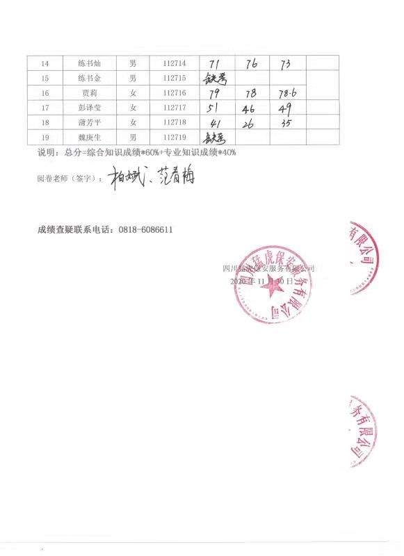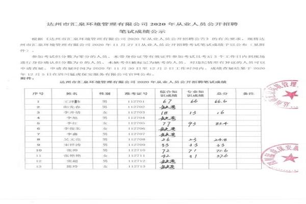 標(biāo)題:達(dá)州市匯泉環(huán)境管理有限公司2020年從業(yè)人員公開招聘參加筆試成績(jī)公示